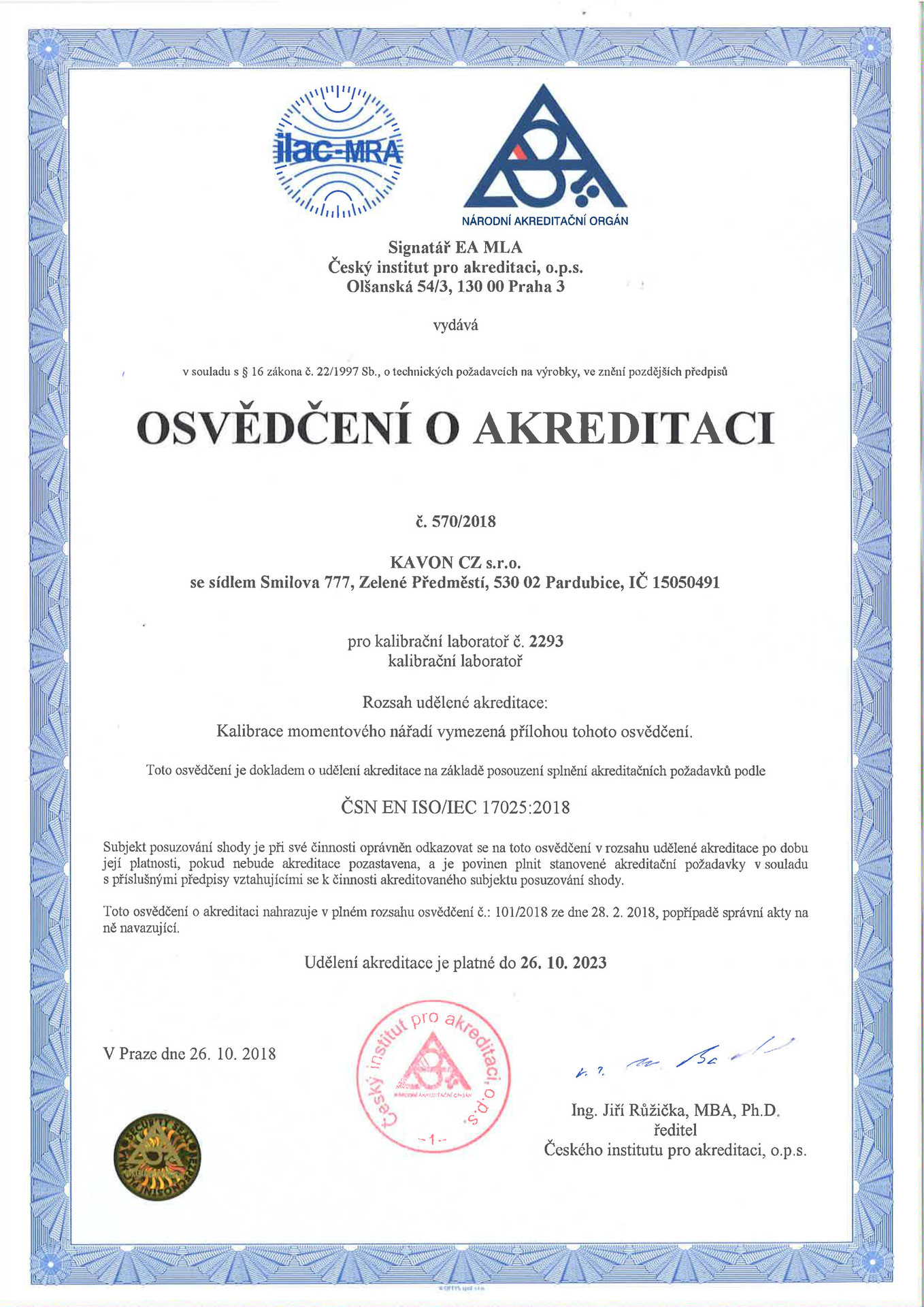 Kalibrační laboratoř je organizačně začleněna do firemního systému KAVON CZ s. r. o. a pro zákazníky vystupuje jako samostatné středisko. Kalibrační laboratoř vznikla v lednu roku 1999. V roce 2003 byla v oboru momentu síly poprvé akreditována národním akreditačním orgánem. V současné době splňuje akreditační kritéria podle ČSN EN ISO/IEC 17025:2018 a na základě vydaného osvědčení může kalibrační laboratoř provádět akreditované laboratorní i externí kalibrace měřidel momentu síly a rotačních nástrojů v rozsahu 0,1–5000 Nm. Kalibrační laboratoř sídlí v provozovně firmy KAVON CZ s. r. o. na adrese Medlešice 139, 538 31 Chrudim.