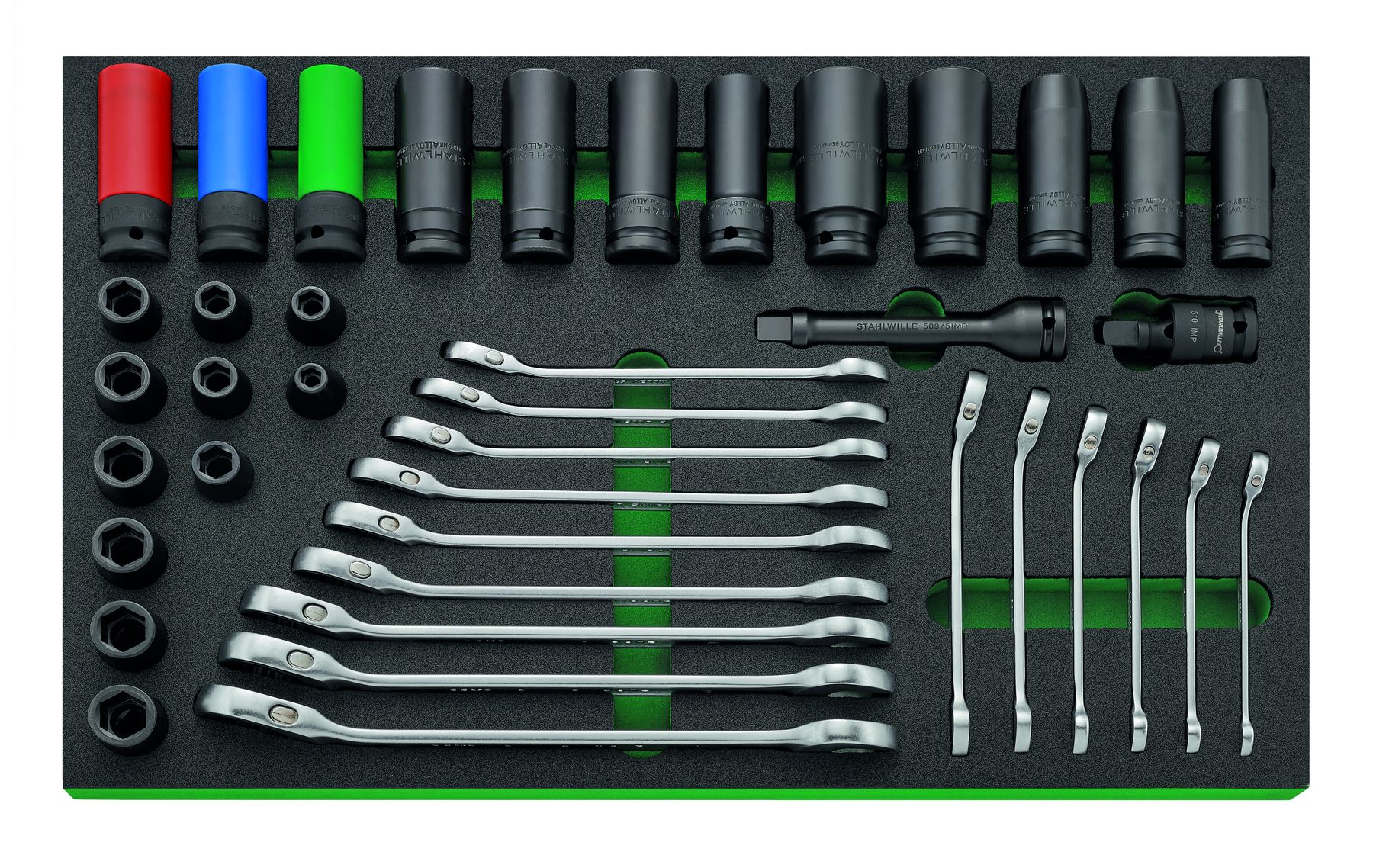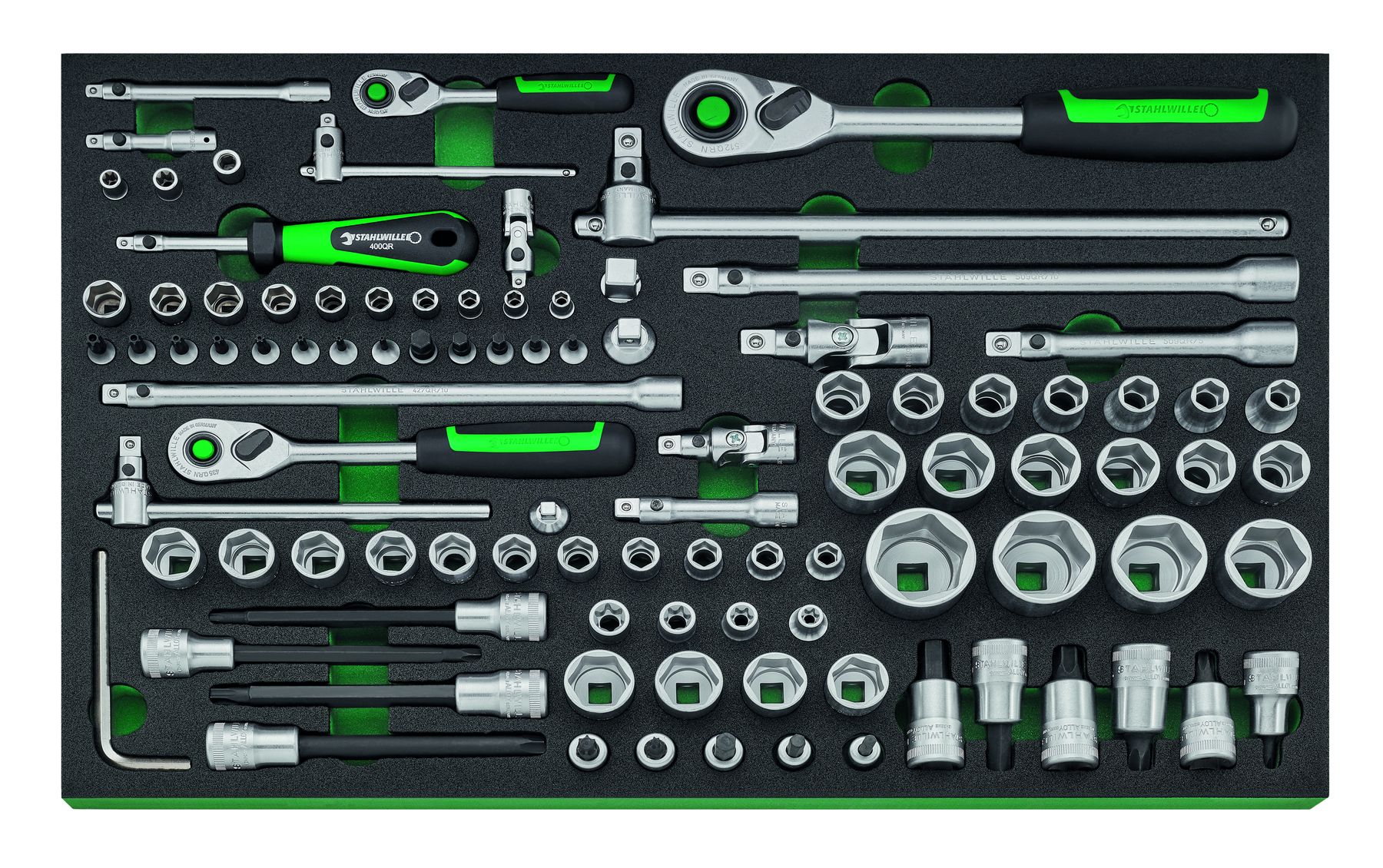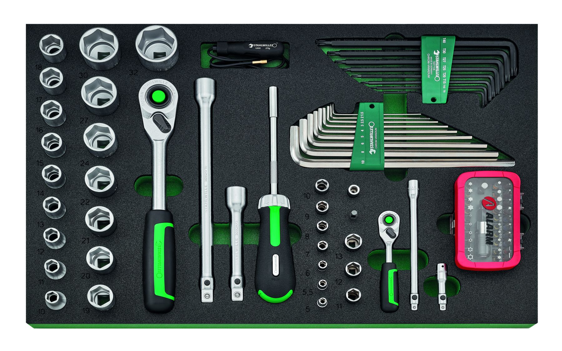 - торцевые ключи 1/4 "и 1/2" (5–32 мм), QuickRelease трещотки с маленькими зубьями и принадлежности